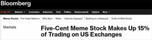 “The little-known healthcare information technology company saw its stock price more than double to just above five cents, with over 3 billion shares changing hands. That was equivalent to about 15% of the total shares traded on US exchanges for the day, data compiled by Bloomberg show.”